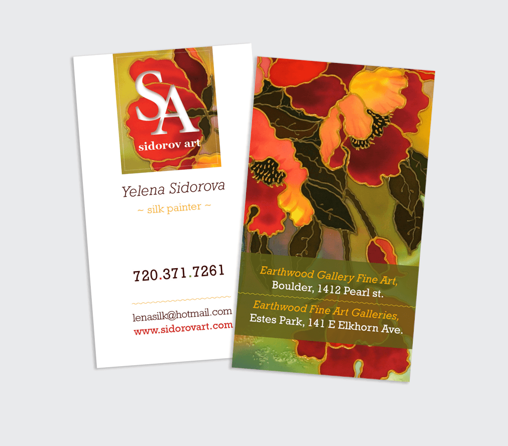Brand identity design for Sidorov Art Fine Art Gallery. The layout pairs a bold monogram logo with richly colored painting, allowing the artwork to be the primary focus and highlighting craftsmanship and distinct artistic individuality.